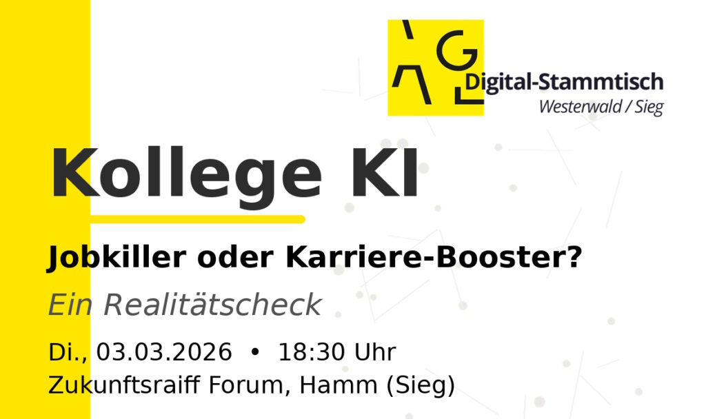 KI: Jobkiller oder Karriere-Booster? Ein Realitätscheck. So lautet das Thema des nächsten Digital-Stammtischs Westerwald/Sieg. Täglich liest man Schlagzeilen darüber, wie KI alles revolutioniert – oder bedroht. Doch was passiert wirklich in den Büros des Mittelstands, wenn der Hype verflogen ist? Beim nächsten Digital-Stammtisch Westerwald/Sieg geht es u.a. darum, wie der produktive Arbeitsalltag mit KI heute wirklich aussieht und wie sich Prozesse automatisieren lassen, die ohne KI undenkbar wären. Die Veranstaltung findet am Dienstag, den 03. März, 18.30 Uhr, in Hamm/Sieg statt. Die Teilnahme ist kostenlos, eine Anmeldung ist erforderlich.